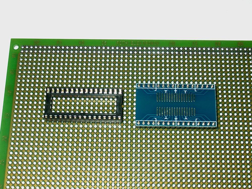 Eine SOP-DIP-Adapterplatine oder auch als Break-Board bezeichnet dient dazu, oberflächenmontierte SMD Bauteile im SOP-Gehäuse (Small Outline Package) für die Verwendung herkömmlichen DIP-Fassungen (Dual In-line Package) im ein Rastermaß 2,54mm anzupassen.
