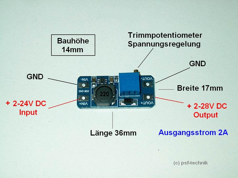Weiterführende Links zu "M900 - Powermodul 2-24V 2A DC/DC Step UP Spannungswandler Fertigmodul 36x17x14mm"