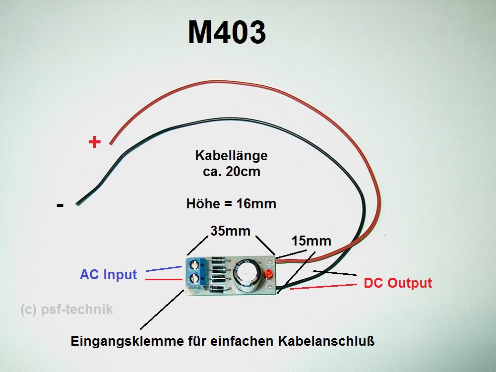 Sehr kleines kompaktes und von der Bauweise schmales Gleichrichtermodul mit Eingangsklemme und fertig verkabelten Ausgang. Im Modellbau insbesondere in der Modellbahn werden viele Verbraucher mit Gleichspannung / Gleichstrom angesteuert. Hierzu zählen insbesondere LEDs. Mit diesem kleinen Fertigmodul ist es auf sehr einfache Weise möglich Wechselspannung zu Gleichspannung umzuwandeln. Zur Glättung der Ausspannungsspannung wurde ein Siebelko verwendet, der Betrieb wird durch eine LED angezeigt. Über die hochwertige Eingnagsklemme können sehr einfach die Kabel angeschlossen werden. Wir empfehlen zur Befestigung einen Heißkleber da das Modul nur 6 Gramm wiegt und es aufgrund seiner Bauweise keine Bohrung zur Befestigung zulässt. Geeignet für alle Spurweiten.